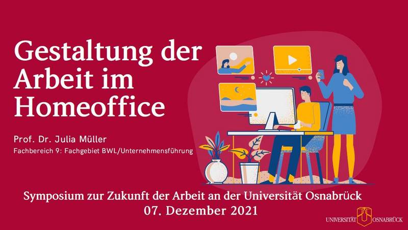 Am 07. Dezember 2021 fand das Symposium zur "Zukunft der Arbeit an der Universität Osnabrück" statt. Neben Frau Prof. Dr. Julia Müller waren auch die Professorkollegen Hajo Holst und Karsten Müller vertreten. Es wurden Untersuchungen zu unterschiedlichen Aspekten des mobilen Arbeitens vorgestellt sowie anschließend im Rahmen einer Podiumsdiskussion diskutiert. Frau Prof. Müller stellte Ihr Projekt zur Gestaltung der Arbeit im Homeoffice vor und bewertete Verhaltensstrategien, welche in Zeiten von Homeoffice von MitarbeiterInnen umgesetzt werden.